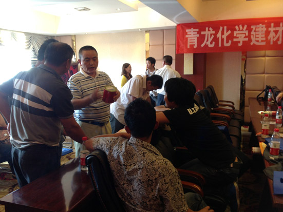 會議結(jié)束后,針對大家提出的“怎樣的材料是綠色環(huán)保的”,“怎樣的施工工藝是綠色環(huán)保的”,“綠色施工在PCM反應(yīng)粘新品上有什么樣的體現(xiàn)”等問題,徐總一一做出詳細的解答,并與大家做了詳細交流。青龍公司向與會人員贈送CQ101水固化聚氨酯防水涂料,并對照GRC樣品進行詳細解說,交流會現(xiàn)場確定了涼山州五縣代理商。