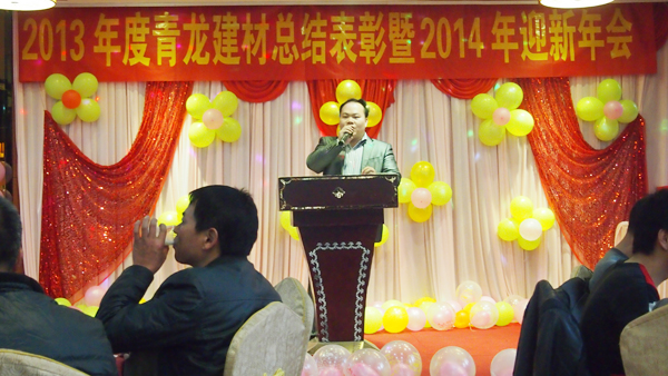 晚宴上,青龍廣西分公司韋流武先生代表集團(tuán)董事長宋總致晚宴開幕辭并送上新年祝福。韋經(jīng)理總結(jié)了2013年青龍廣西化學(xué)建材的發(fā)展歷程,肯定了2013年所取得的成績,并對2014年寄予了美好展望。之后對2013年青龍廣西化學(xué)建材表現(xiàn)優(yōu)異的員工進(jìn)行表彰,鼓勵大家向他們學(xué)習(xí),繼續(xù)為生產(chǎn)中國較好的防水材料而奮斗。