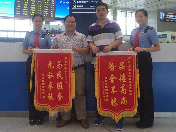 據(jù)悉,青龍公司宋先生在一次出差途經(jīng)過南寧東站時,由于行程匆忙,在候車室將一個重要行李箱遺失。原本以為車站人員混雜,行李箱很難找回,沒想到被正在值班的二班員工陳芳女士細心發(fā)現(xiàn)并通過廣播尋找到宋先生。行李箱的失而復(fù)得,讓宋先生非常驚喜。為感謝動南寧東站客運中心,感謝陳芳女士細心和責(zé)任,更為了宣揚難能可貴的質(zhì)拾金不昧的正能量,出差在外的宋先生特別囑咐同事一定要好好感謝南寧東站客運中心及陳芳女士。