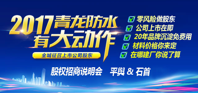 加盟青龍建材股份,20年防水品牌免費(fèi)給你用,投資50萬(wàn),做上市公司股東!合作辦廠,防水材料價(jià)格你說(shuō)了算!心動(dòng)不如行動(dòng),選擇大于努力!