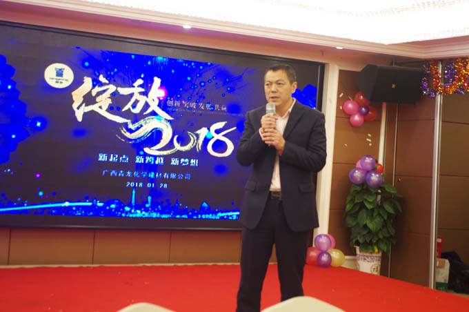 年會在公司董事長宋董的致辭中,拉大盛幕。宋董總結了2017年公司的收獲,公司整體業(yè)務增長30%以上,成長趨勢好;特別是8月26日以來,新成立的家裝事業(yè)部,新零售店招商勢頭發(fā)展迅猛至1月份,合作及加盟商將近100家。同時展望2018,希望大家一起努力,讓公司更快更好的發(fā)展。特別是家裝提出招募目標500家新零售加盟商,達到行業(yè)一線品牌。對工程防水和GRC業(yè)務,也提出了目標整體在2017年的基礎上30%以上增長,要實現(xiàn)公司業(yè)務結構跨越式發(fā)展步伐。青龍公司籌劃上市鼓舞著每一位青龍員工士氣,為防水事業(yè)做出不懈努力,帶領大家賺大錢。