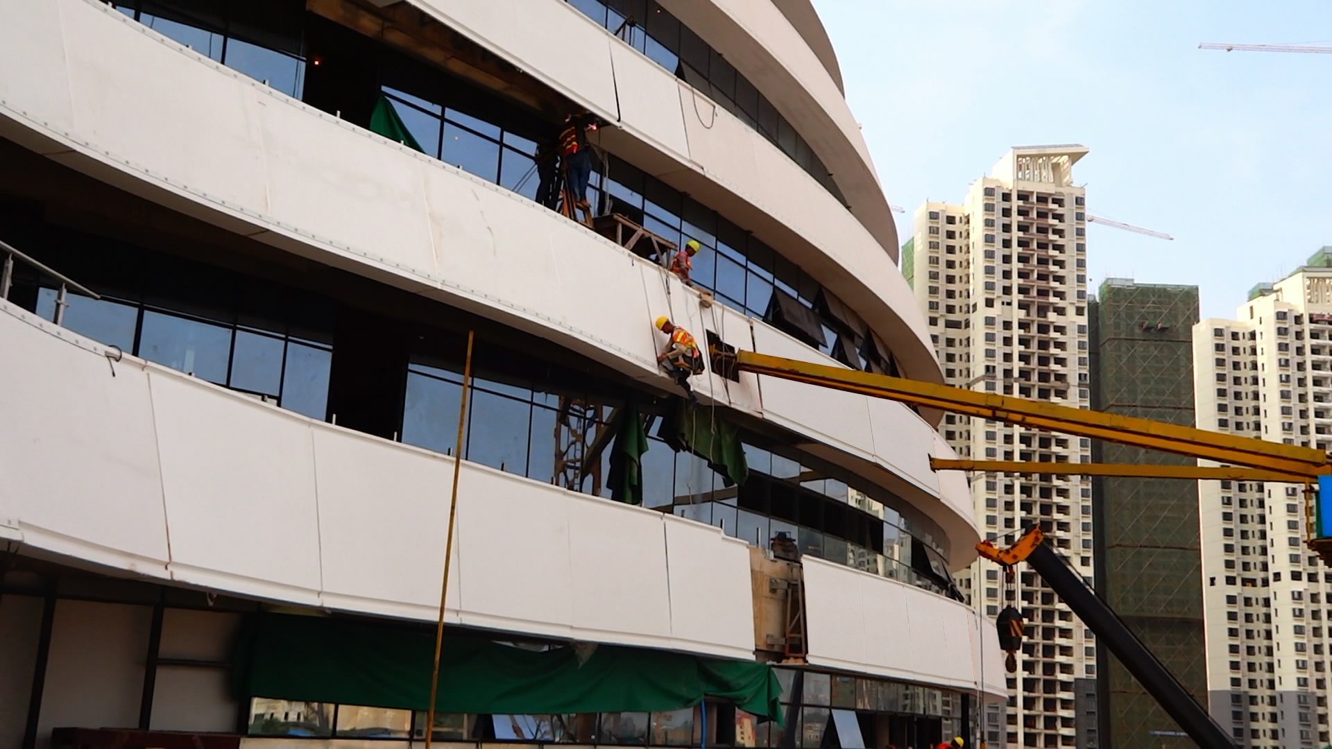 青龍公司作為國內GRC領域的知名企業(yè),承接了新媒體中心三座主體結構的雙曲面外墻板項目。由于所有的面板沒有一片完全相同,不僅要經(jīng)受高空風雨的侵蝕,相鄰兩塊更要緊密榫合,天衣無縫,并在整體上形成流線性美感,因此需要制作大量的模具,工程極為繁瑣。但青龍GRC團隊克服重重困難,從圖紙深化設計、彩色GRC選材、造型產(chǎn)品生產(chǎn)到安裝施工等一系列工序中都做到極致,讓甲方和監(jiān)理都非常滿意。
