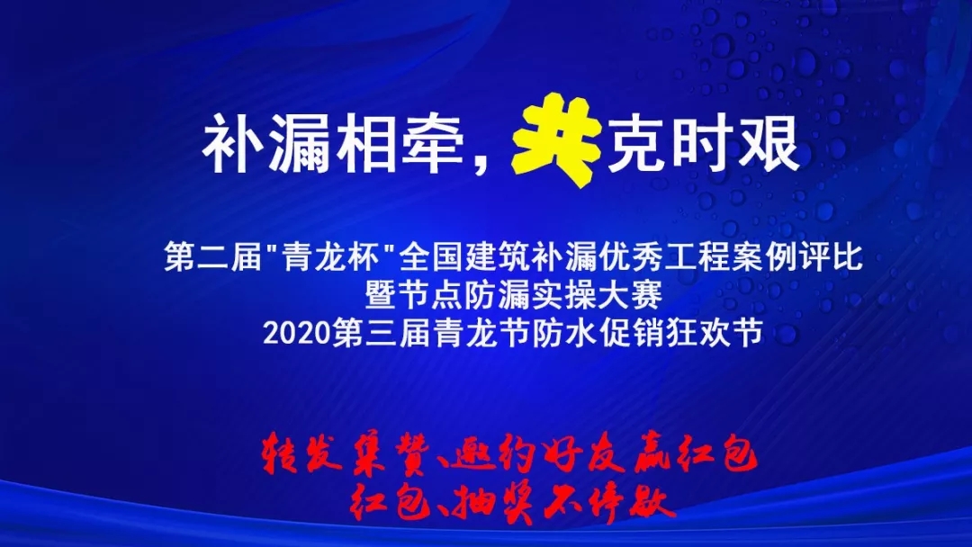 2月24日,第二屆"青龍杯"全國建筑補(bǔ)漏優(yōu)秀工程案例評比暨節(jié)點(diǎn)防漏實(shí)操大賽、2020第三屆青龍節(jié)防水促銷狂歡節(jié)將正式網(wǎng)上直播。