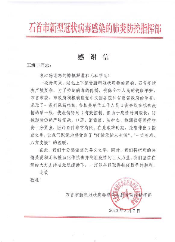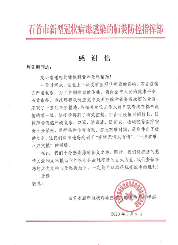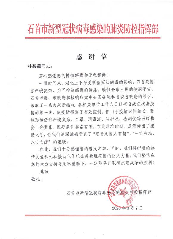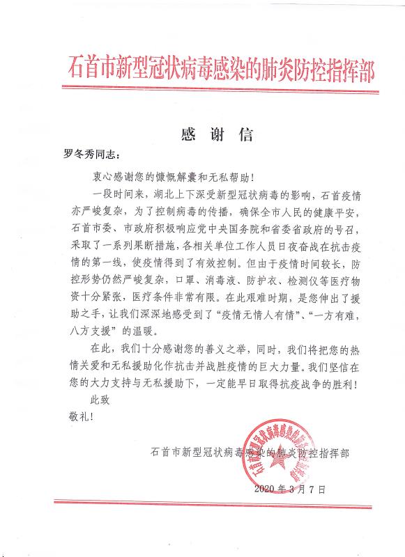 當(dāng)全國(guó)疫情數(shù)據(jù)持續(xù)向好,各地復(fù)工復(fù)產(chǎn)有序進(jìn)行的時(shí)候。青龍公司收到了來(lái)自湖北省石首市新型冠狀病毒感染的肺炎防控指揮部16封特殊的感謝信。