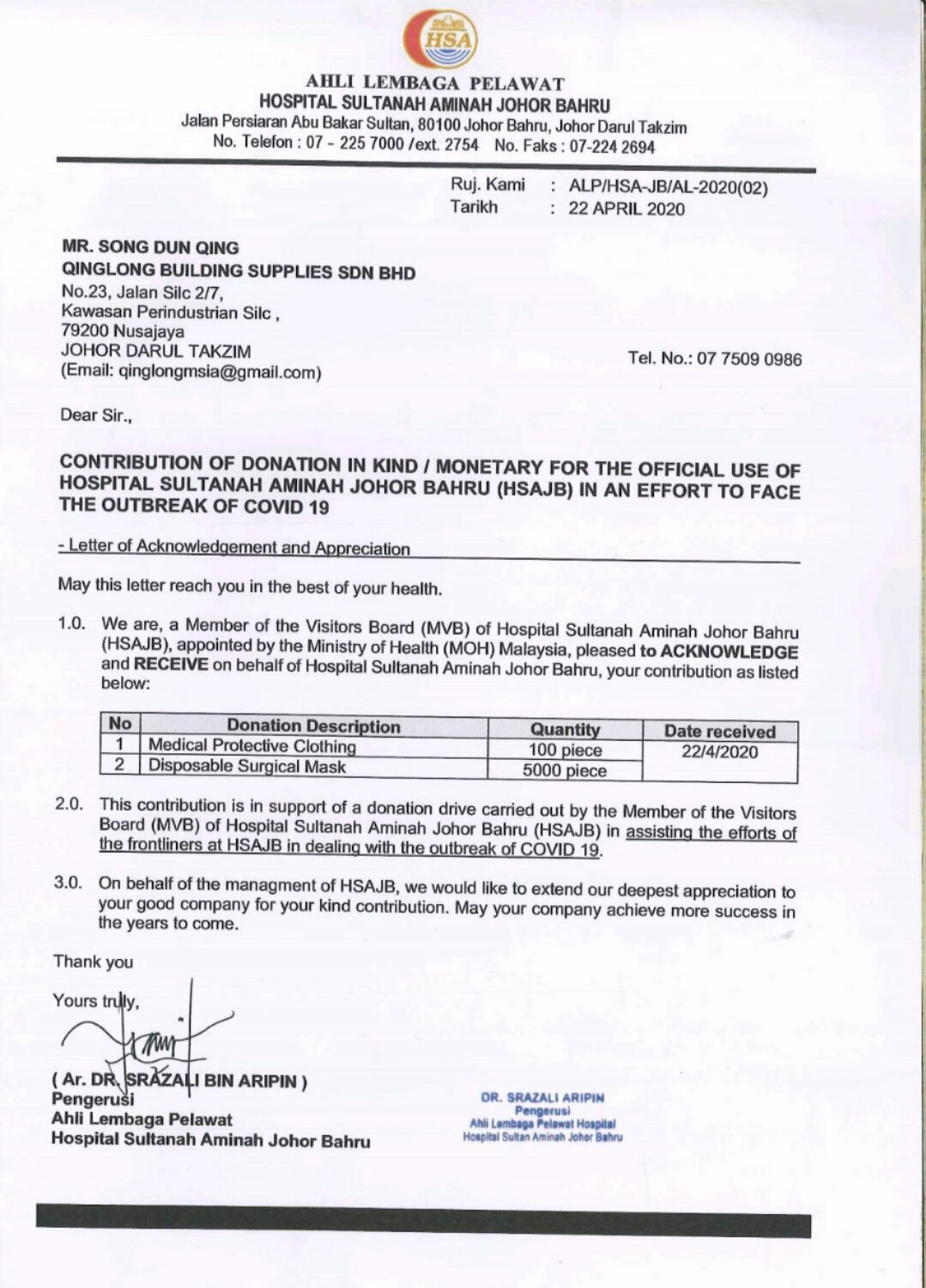 近日,馬來西亞Hospital Sultanah Aminah柔佛州新山醫(yī)院在收到物資后,致函表示了真誠的感謝,感謝青龍公司和廣大客戶的仁義之舉。