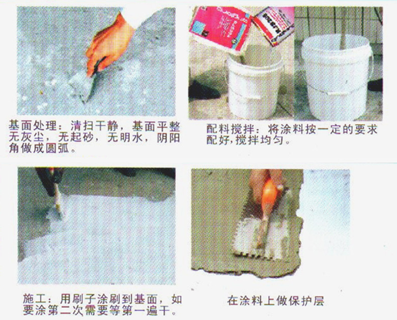 1.適用于屋面、地下工程隧道、泳池、食用水池及室內(nèi)工程基面,如:剛凝固的水泥砂漿找平層上,地下室剛拆模的基面上,或基面淋雨潮濕(無明水)均可直接施工。
