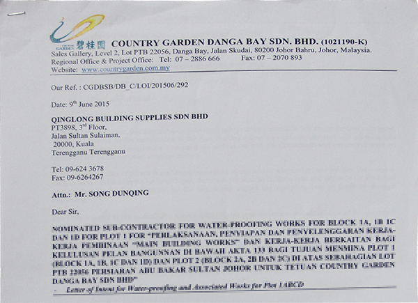青龍集團營銷總監(jiān)賀先生表示,此次競標(biāo)碧桂園馬來西亞金海灣防水項目共有多家防水企業(yè),經(jīng)過激烈角逐,青龍公司與東方雨虹等四家防水企業(yè)最終脫穎而出,且青龍與東方雨虹分別獲得防水面積較大的兩個項目。該防水項目的最終落實不僅是青龍集團開拓國際市場的又一成功案例,也表明了青龍防水材料防水效果顯著,技術(shù)實力強勁,得到了國內(nèi)外客戶的高度肯定。