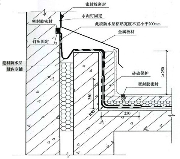 高平縫:清縫→縫內填充→鋪貼"U"形卷材→“U”形內嵌入泡沫棒→鋪貼高分子卷材隔離層→保護層→混凝土或金屬蓋板。 高低縫:清縫→縫內填充→鋪貼"U"形卷材→收頭收入凹槽并用壓條或墊片釘壓 固定→凹槽上部用金屬批水板釘壓固定→收頭密封 |