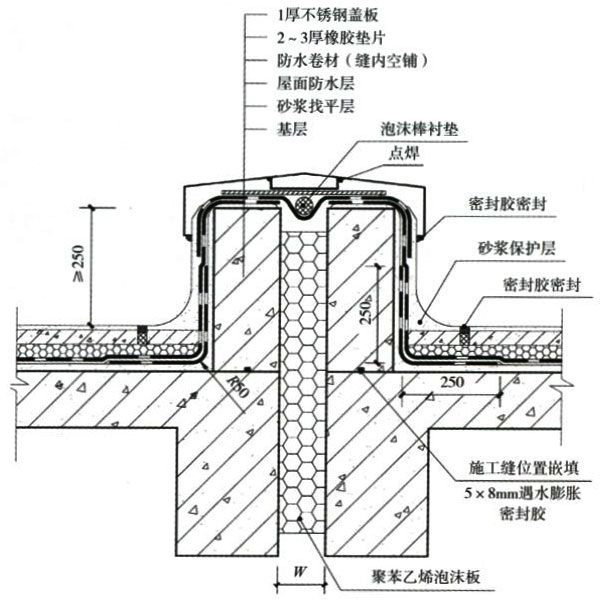 《屋面工程技術規(guī)范》 GB 50345-2012 4.11.18變形縫的防水構造應符合下列規(guī)定: 1.變形縫泛水處的防水層應增設附加層,附加層在平面和立面的寬度不應小于250mm;防水層應鋪貼或刷至泛水墻的頂部。 2.變形縫內應預填保溫材料,上部應采用防水卷材封蓋,并放置襯墊材料,再在其上干鋪一層卷材。 《屋面工程質量驗收規(guī)范》 GB 50207-2012 8.6.5 等高變形縫頂部宜加扣混凝土或金屬蓋板。混凝土蓋板的接縫應用密封材料封嚴;金屬蓋板應鋪釘牢固,搭接縫應順流水方向,并應做好防銹處理。 8.6.6 高低跨變形縫在高跨墻面上的防水卷材封蓋和金屬蓋板,應用金屬壓條釘壓固定,并應用密封材料封嚴 |