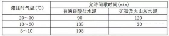 ⑺混凝土澆筑必須連續(xù),因施工需要留設(shè)施工縫,必須征得設(shè)計同意,并得到監(jiān)理認(rèn)可。允許間歇時間具體見下表;搗固選用的振搗器,其頻率、振幅、振動速度等參數(shù)視混凝土的塌落度及骨料顆徑而定。