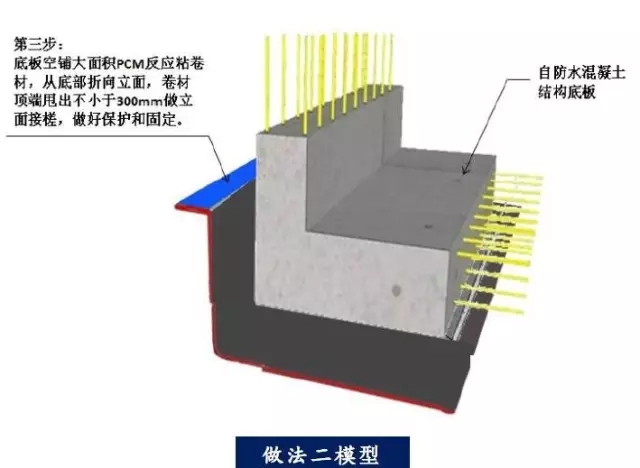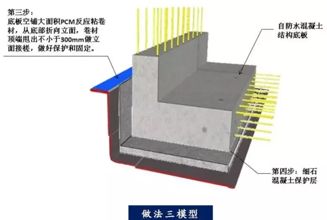 地下室底板防水做法三:防水層反粘于上面的保護(hù)層