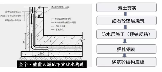 地下室底板防水做法二:防水層反粘于后澆結(jié)構(gòu)底板