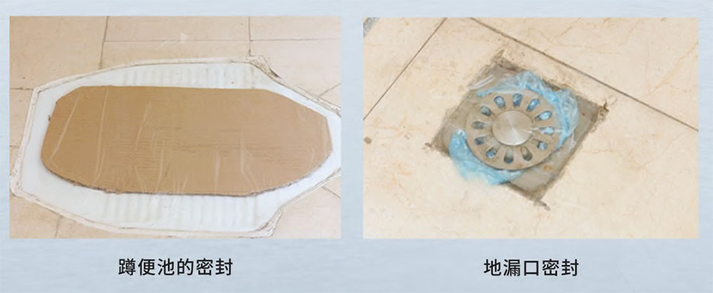②拿開地漏,用塑料袋堵住地漏,并用膠帶固定密封,直至保證水漏不下去為止,(必須先堵好地漏,以免材料凝膠后堵塞下水道)。如果大便器是蹲式的,需用紙板或泡沫板裁剪成與蹲便器大小相近的形狀并用膠帶固定密封,以防止?jié){液流入大便池后凝膠造成下水道堵塞。廚房衛(wèi)生間門口位置如果低于2厘米高的,請用泡沫板在門口做一道高3厘米的堤壩,防止材料流出。