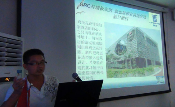 在培訓(xùn)會(huì)上,蘇小麗全面地介紹了公司生產(chǎn)的各類(lèi)藝術(shù)產(chǎn)品,并對(duì)它們的生產(chǎn)工藝、安裝細(xì)節(jié)及應(yīng)該注意的問(wèn)題進(jìn)行了詳細(xì)的解說(shuō)。龍江則主講《GRC在現(xiàn)在工程中的應(yīng)用》,從GRC外墻板、裝飾構(gòu)件以及園林景觀方面的案例出發(fā),向與會(huì)的人員展現(xiàn)了GRC在工程中的魅力。不少參加會(huì)議的人員都表示受益匪淺,“現(xiàn)在對(duì)公司生產(chǎn)的產(chǎn)品有了一個(gè)系統(tǒng)的了解,在GRC的安裝工藝方面也增長(zhǎng)了不少見(jiàn)識(shí),相信對(duì)以后的工作會(huì)有很大的幫助。”