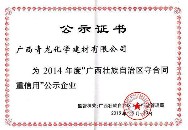 近日,青龍集團(tuán)廣西公司喜訊頻傳,獲得廣西區(qū)工商管理局頒發(fā)的2014年度廣西壯族自治區(qū)“守合同重信用企業(yè)”榮譽(yù)稱號(hào),市工商局特別頒發(fā)了證書(shū)。